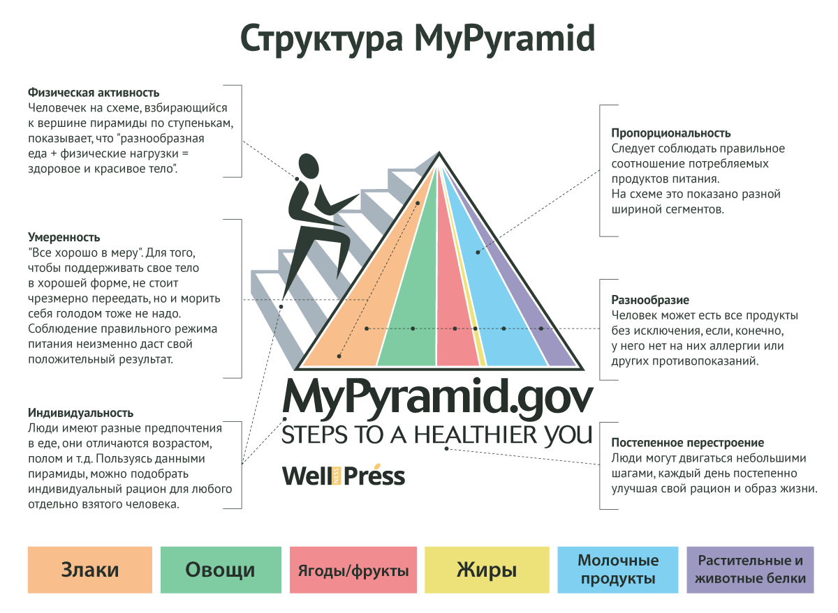 Они поддерживают проект MyPyramid, разработанный диетологами из Америки, принимая при этом во внимание различия в пищевых предпочтениях россиян и американцев