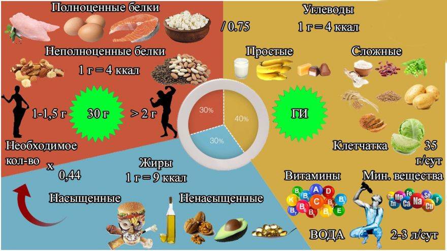 - Белки – 3 и более г на кг веса тела, углеводы 3, жиры – по 0,5.