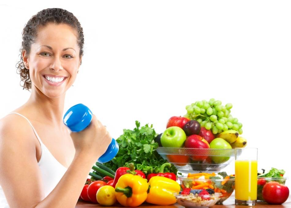 улыбчивая брюнетка с гантелей в руке на фоне овощей и фруктов, которые можно кушать после тренировки