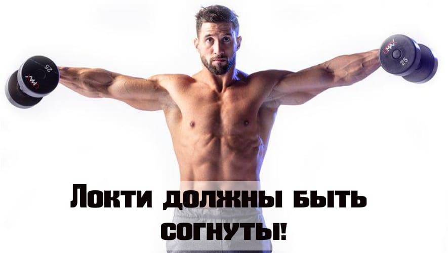 - При подъемах и опусканиях гантелей, руки имеют небольшой изгиб в локтях, что позволит снять нагрузку с локтевых суставов и сосредоточить ее на передних дельтах.