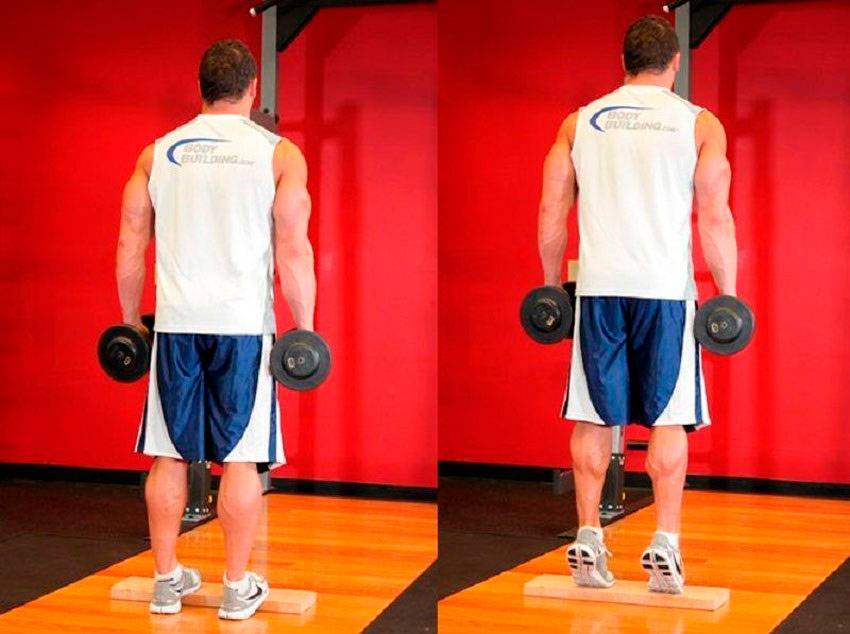 Без этого не получится акцентировать нагрузку на икрах во время прохождения негативной фазы амплитуды, а она в этом упражнении отвечает как минимум за 50% результата. Вместо гантель можно использовать гири, особой разницы нет. Можно делать это упражнение, стоя на одной ноге, а гантель удерживать в противоположной руке, так вы дополнительно нагрузите еще и мелкие мышцы, отвечающие за баланс и координацию.