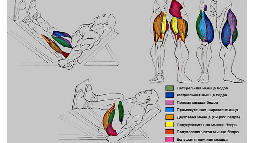 В жиме ногами лежа работают передние и задние мышцы бедра. А также большая ягодичная мышца.