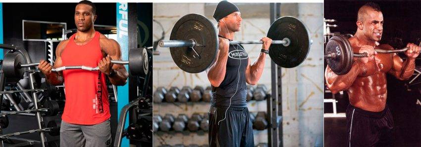 - Подъем с изогнутой штангой. Цель использования такого грифа – снятие нагрузки с кистей. Бицепс прорабатывается и в подъеме с изогнутой штангой тоже;