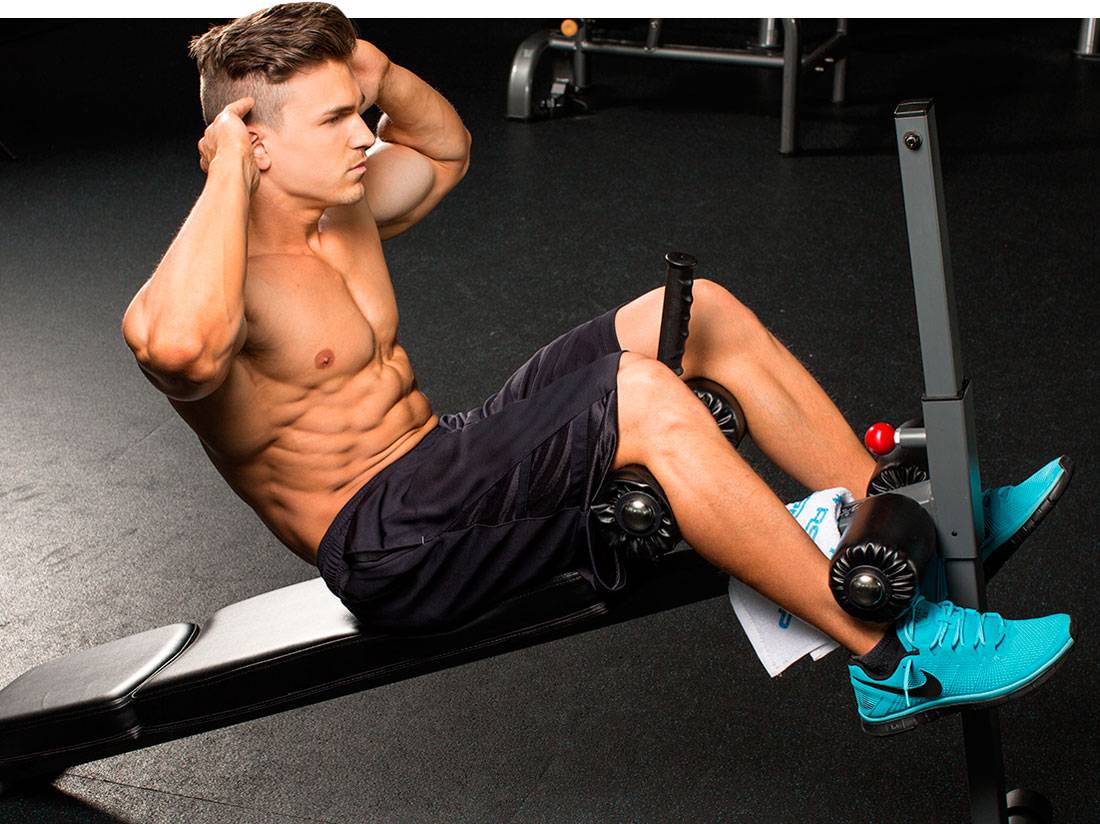 - Расположите колени на валиках тренажера, а голеностопы – зафиксируйте в упорах;
