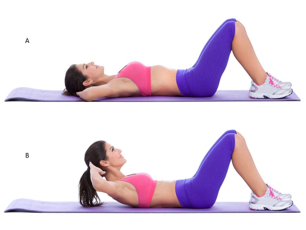 Выполнение: лечь на коврик, руки за голову, ноги согнуты в коленях.