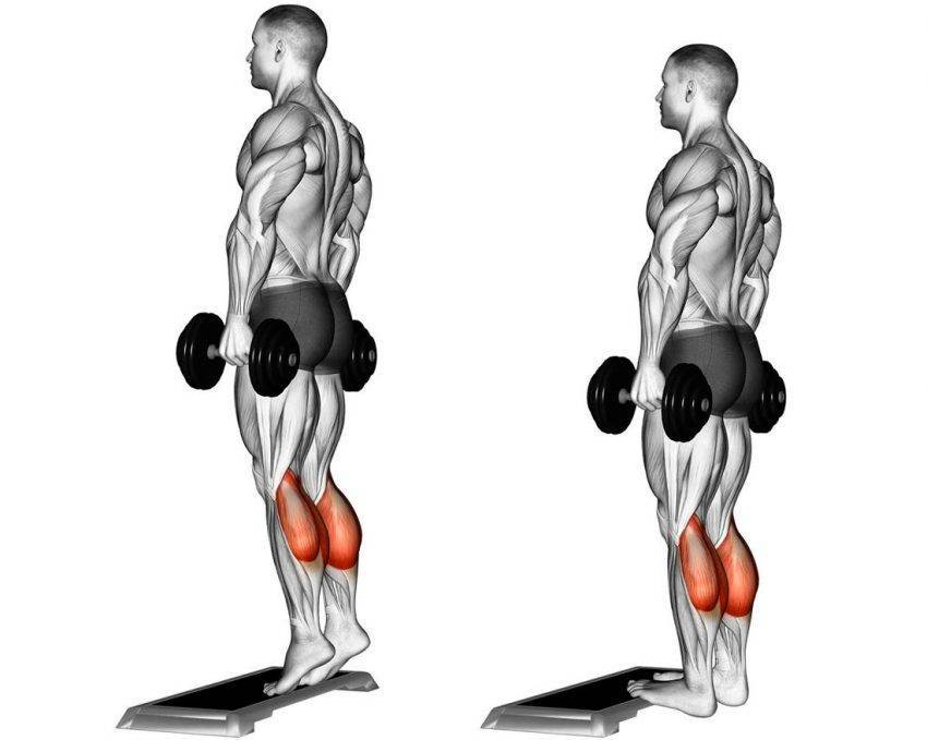 В движении работают как камбаловидные, так и икроножные. Оно считается основным для развития икр. Упражнение выполняют с гантелями, но некоторым атлетам удобней вариация со штангой, так как с гантелями сложно добиться высокого отягощения. Тем, кого подводит хват, рекомендуют брать лямки.