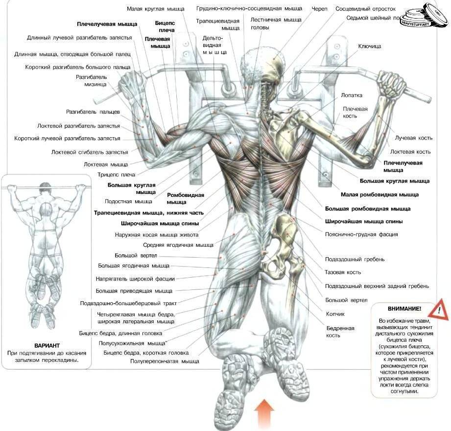 Говоря о подтягивании обратным хватом нужно знать, какие мышцы работают в этом и при иных вариантах упражнения, следует назвать следующие их группы: