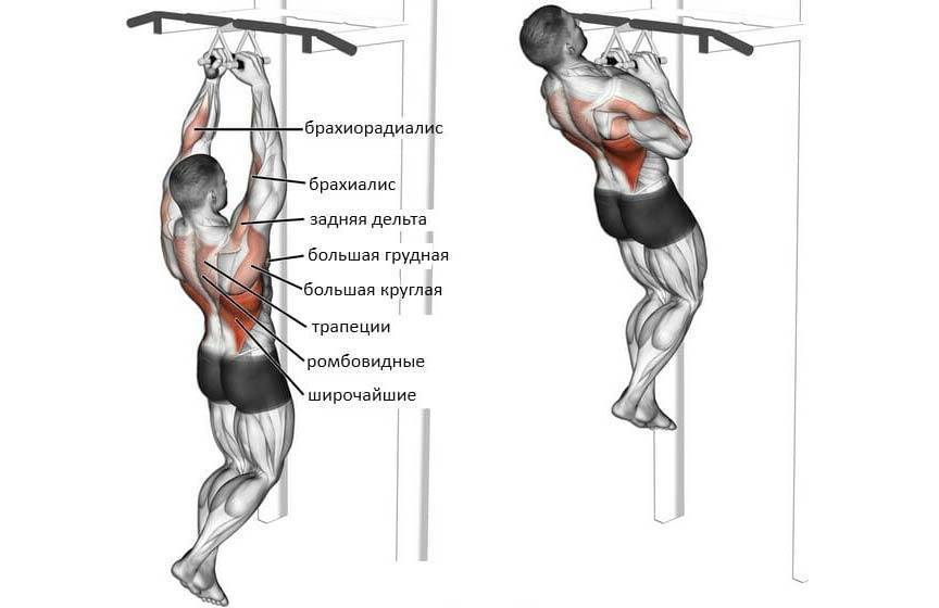 Следом идут трапециевидные мышцы и большая круглая мышцы спины. Однако исключить нагрузку на руки, а именно — на бицепсы и предплечья, никак нельзя, да и стоит ли?
