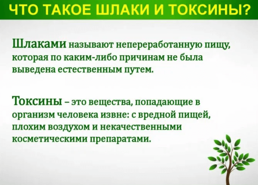 Такая диета, направленная на избавление от шлаков, подразумевает небольшой период голодания, после которого человек переходит на рацион из фруктов, овощей, соков или воды. Иногда допустимы травяные чаи и прием пищевых добавок; некоторые приверженцы детокса также делают регулярные клизмы для очищения кишечника.