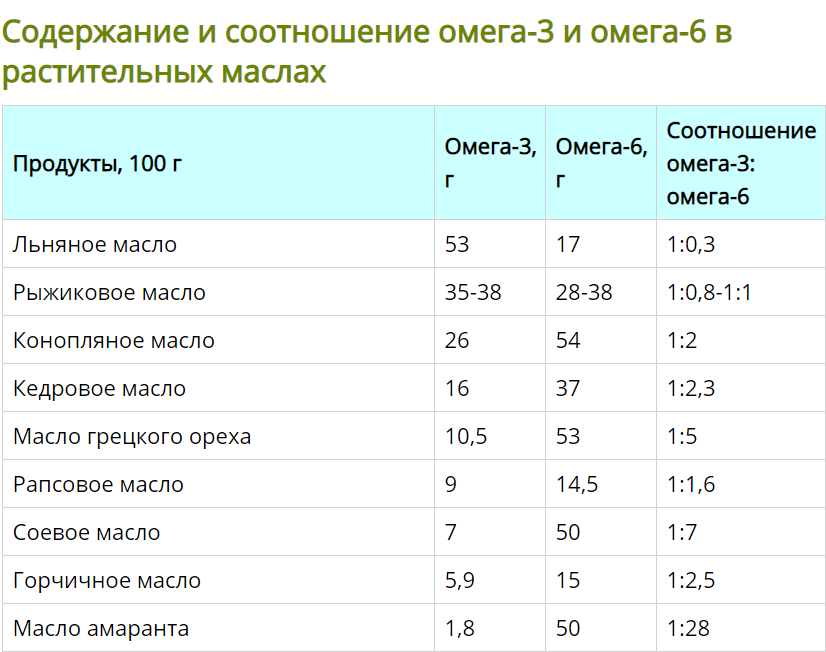 | Название продукта, 100 г | Омега-3, г | Омега-6, г | Соотношение омега-3 : омега-6 |