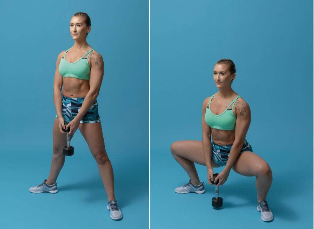 Для позиции сумо нужно широко расставить ноги, развернув при этом носки наружу. Отвести бедра назад и присесть до образования прямого угла в коленях, после чего как можно сильнее напрячь ягодичные мышцы и вернуться в положение стоя.