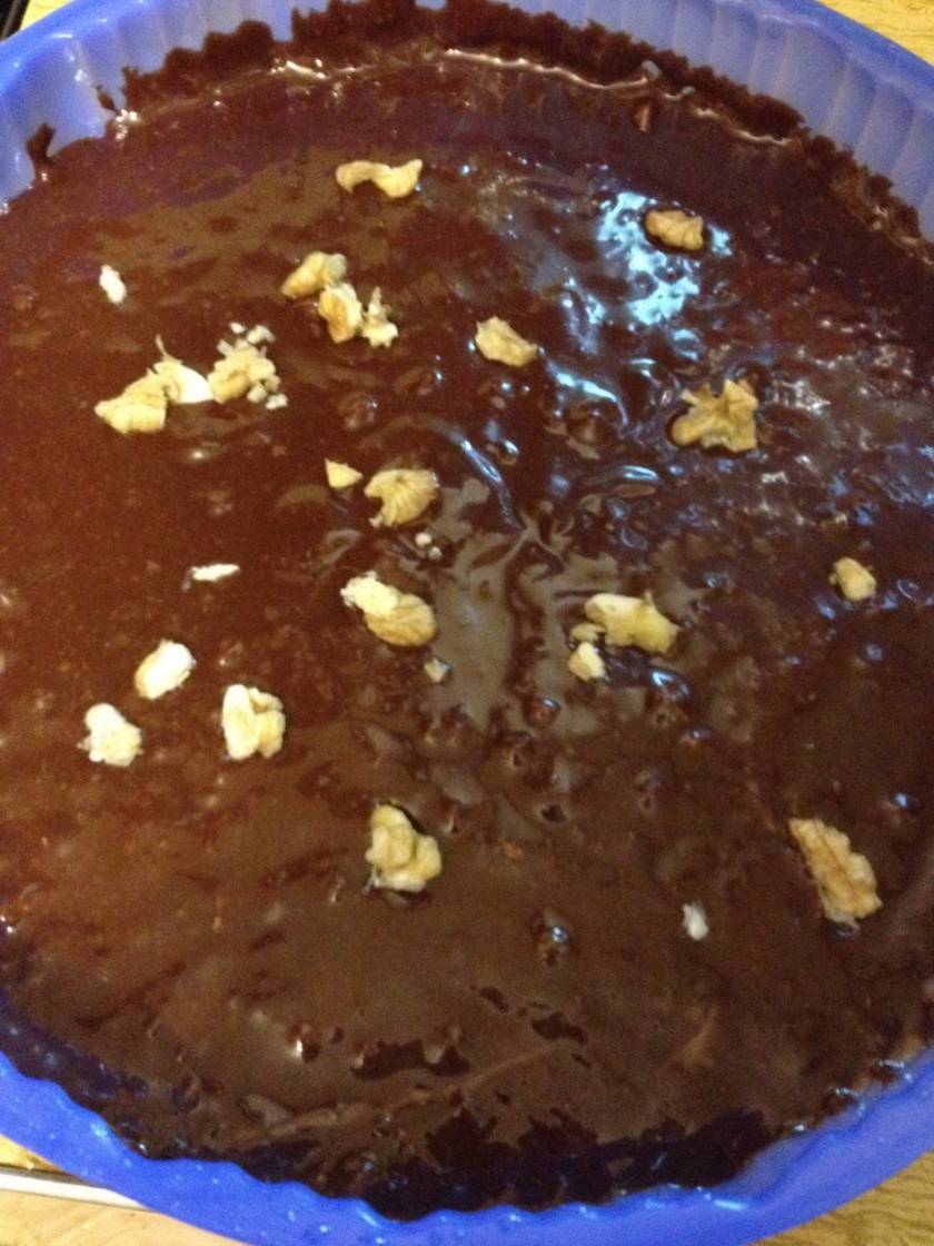 По консистенции тесто получается достаточно жидкое и тягучее. Орехи можно добавить сейчас, либо разделить и часть смешать с тестом, а часть высыпать сверху нашего брауни передд тем, как поставить в печь. Так у нас получится побольше орехов на поверхности нашего коржа.
