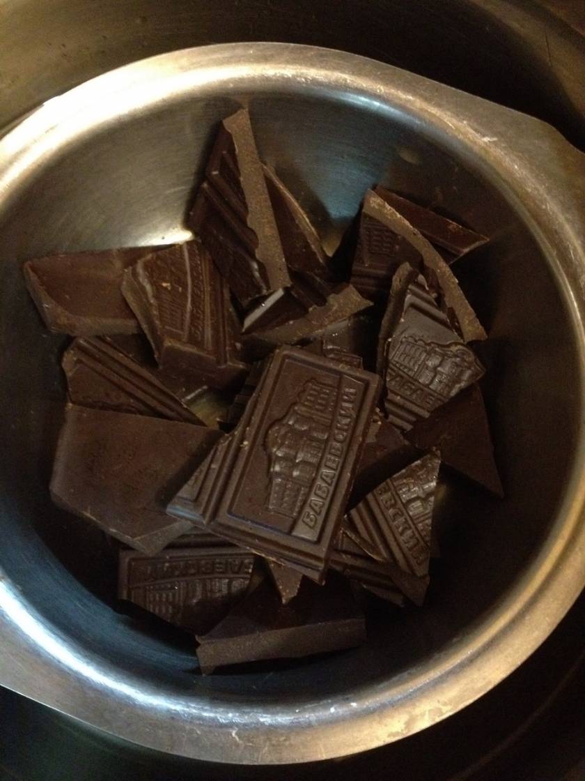 - В одной емкости растопить на водяной бане 200 г масла и поломанный на небольшие кусочки шоколад.