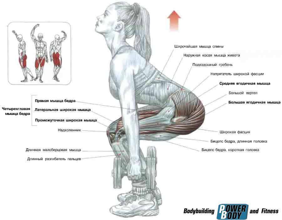 Сложность выполнения приседаний с гантелями — средняя. Упражнение задействует большое количество мышц. Основные