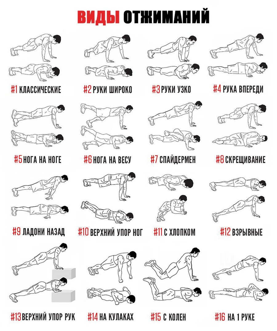 Другие варианты отжиманий смотрите на изображении. Они призваны как для изменения степени нагрузки, так и для смещения акцента на различные группы мышц.