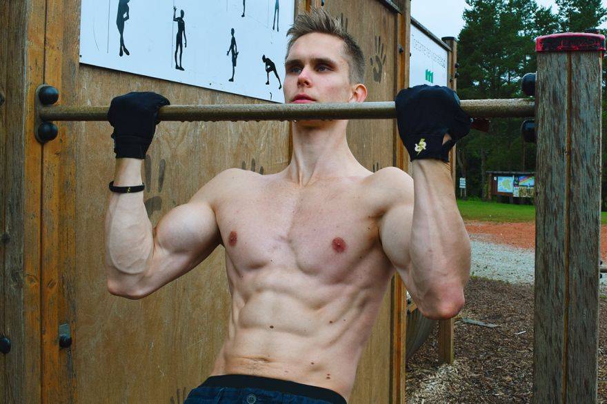 - Подтягивания тела с широким хватом – это базовое упражнение, оно выполняется после разминки. Всего требуется 4 подхода, во время каждого совершается максимальное количество повторений, но на этом этапе не следует допускать переутомления, поскольку основной тренировочный процесс еще впереди.