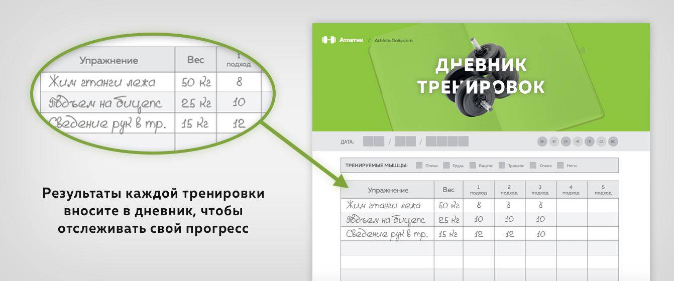 Дневник тренировок — это блокнот или приложение, куда вы вносите данные о тренировке: какие сделали упражнения, сколько подходов, повторений, какой рабочий вес и т.д.