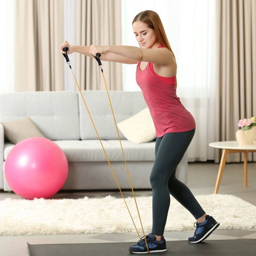 - фитнес-эспандер. Это удобный снаряд, который отлично подходит для занятий дома. Его можно подобрать по силе натяжения: для начинающих – с минимальным, для опытных – более жесткие. С помощью эспандера можно тренировать различные группы мышц;