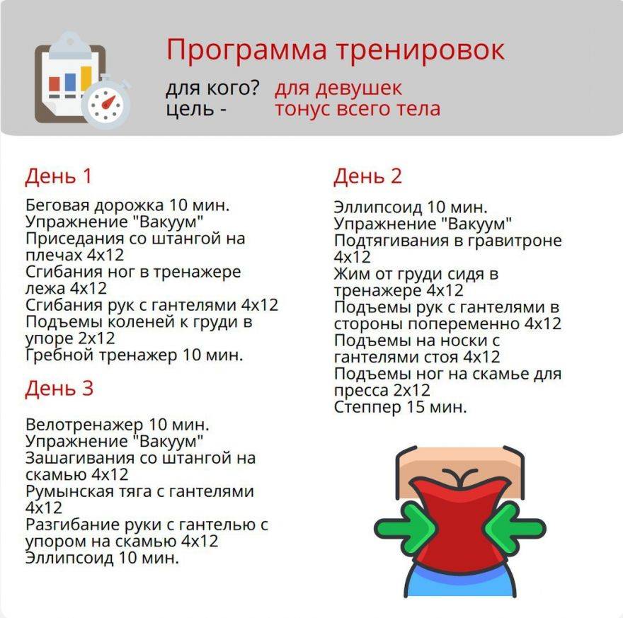 Для снижения веса и приобретения красивого рельефа без наращивания мышечной массы девушкам достаточно такой тренировки 3 раза в неделю.