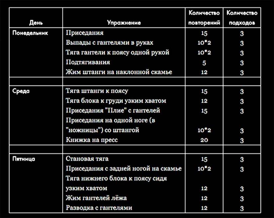 Новичкам, начинающим тренировки в зале, рекомендуется выполнять предложенную ниже программу 2-3 раза в неделю, на протяжении первых 1-2 месяцев. Упражнения выполняются в 3-4 подхода по 10-12 повторений в каждом, перерыв между подходами — от 30 до 60 секунд.