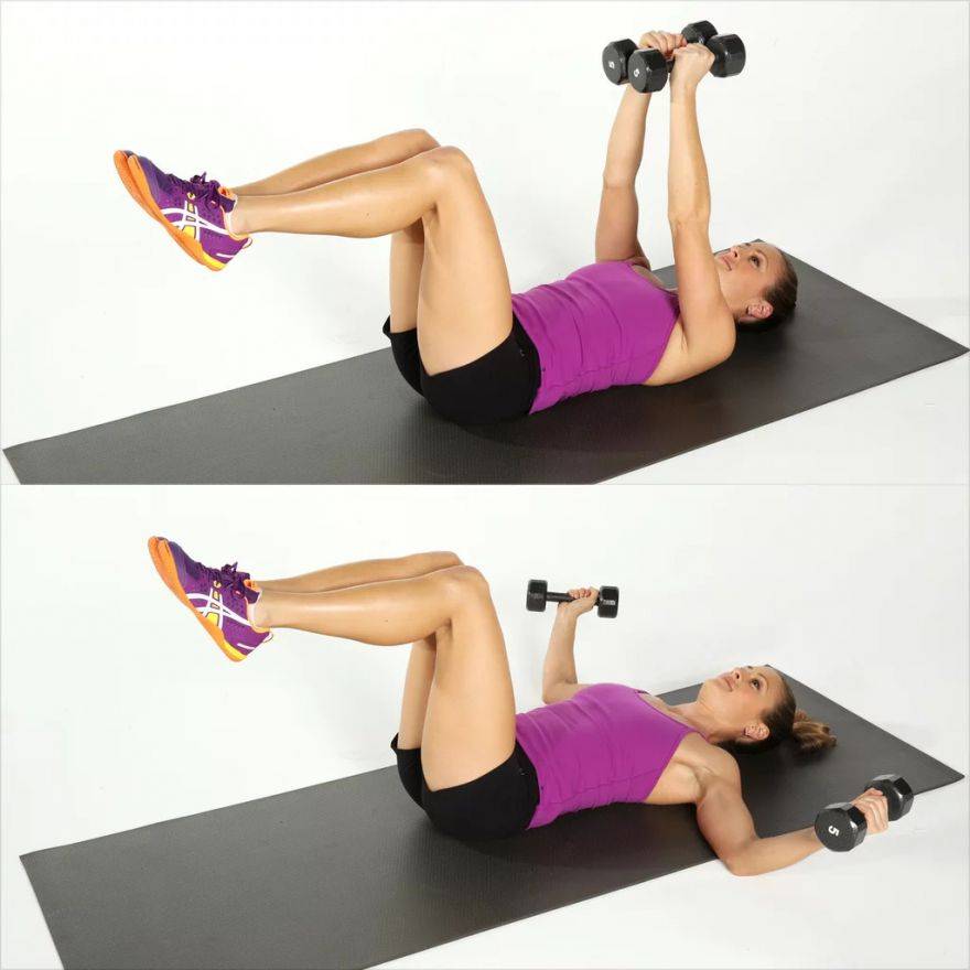 Лечь спиной на скамью, гантели взять в руки и поднять над грудью. Далее руки следует разводить в разные стороны.