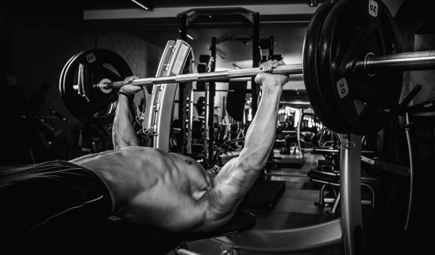 - жим штанги лежа — 3 сета по 8–12 повторов;