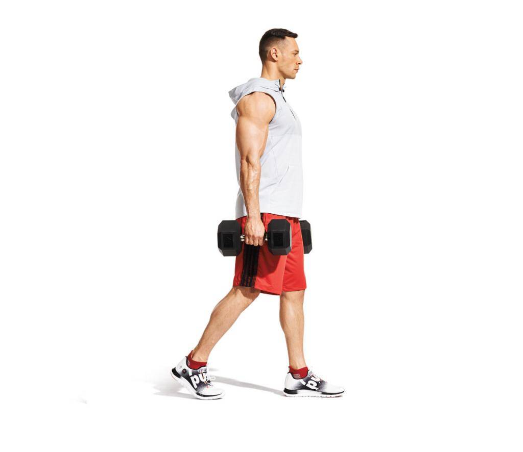 Возьми тяжелую гантель в одну руку и, стараясь удерживать корпус вертикально, иди вперед. Пройди равное расстояние для правой и левой руки.