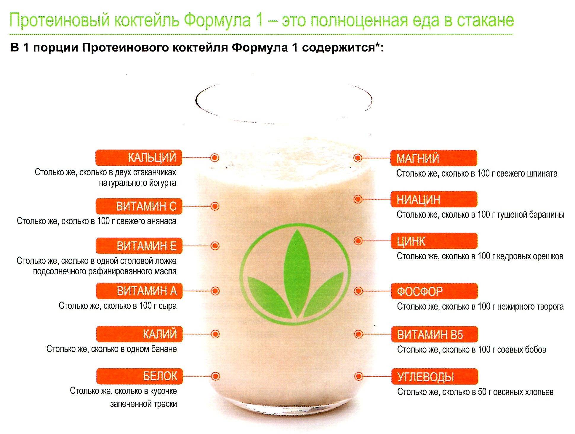 Белковая смесь состоит из жидкой основы, белка, источника жиров и углеводов.