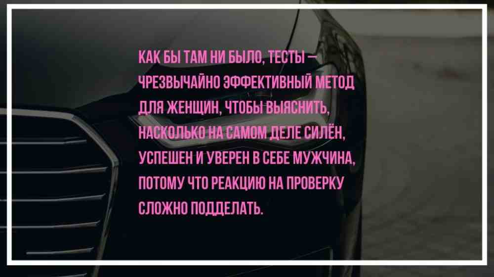 Как бы там ни было, тесты – чрезвычайно эффективный метод для женщин, чтобы выяснить, насколько на самом деле силён, успешен и уверен в себе мужчина, потому что реакцию на проверку сложно подделать.