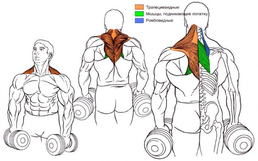 Самый главный движитель – трапециевидные мышцы. Когда атлет стоит прямо и приводит гантели на уровень выше карманов, в работу включаются обе трапециевидные мышцы, они позволяют поднять вес, и не свести плечи вперед. Трапециевидная мышца поднимает плечо и участвует в «срыве» веса с пола во всех силовых и тяжелоатлетических упражнениях. Ее сокращение при расслабленных мышцах руки позволяет выполнить шраг. На самом деле, упражнение является изолирующим, с каким бы снарядом не выполнял его атлет.