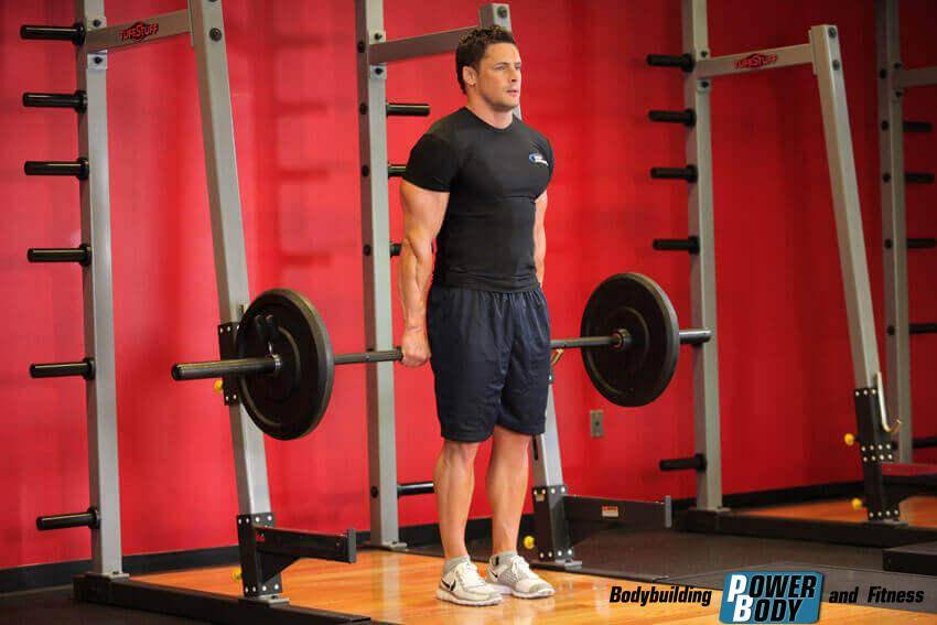 Штангу можно держать сзади, нагрузка при этом распределяется немного иначе. При штанге перед собой особенно сильно нагружаются передние пучки мышечных волокон трапеции, а при положении за спиной напрягаются задние пучки волокон. Положение штанги можно чередовать как по сетам, так и по дням.