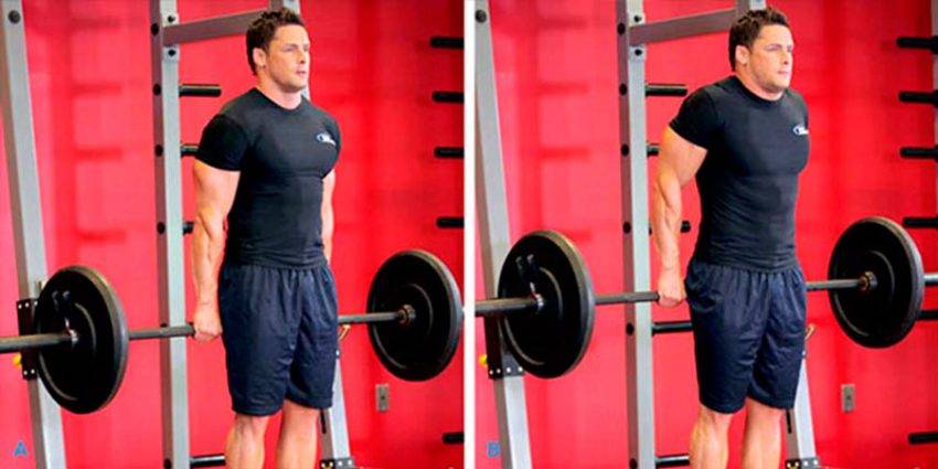 Шраги со штангой мало отличаются по технике от аналогичного упражнения с гантелями для трапеции и спины. Существует две вариации: