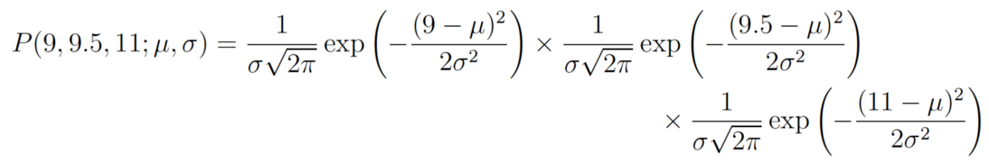 Возьмем другой пример. Предположим, что на этот раз у нас есть три точки данных, и мы допускаем, что они были получены в результате процесса, который адекватно описывается распределением Гаусса. Эти точки имеют значения 9, 9,5 и 11. Как нам вычислить оценки максимального правдоподобия для значений параметров распределения Гаусса μ и σ?