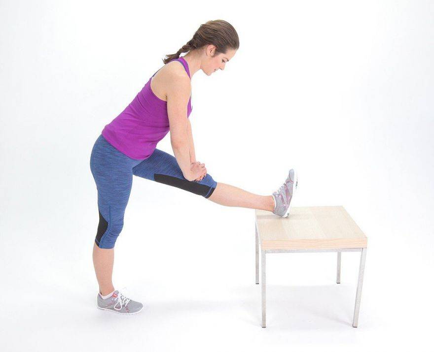 - Следует опереться о любой предмет правой рукой. При прямой спине необходимо согнуть левое колено, а затем подтянуть носок к ягодицам. Держать эту позицию нужно на протяжении 30 секунд.