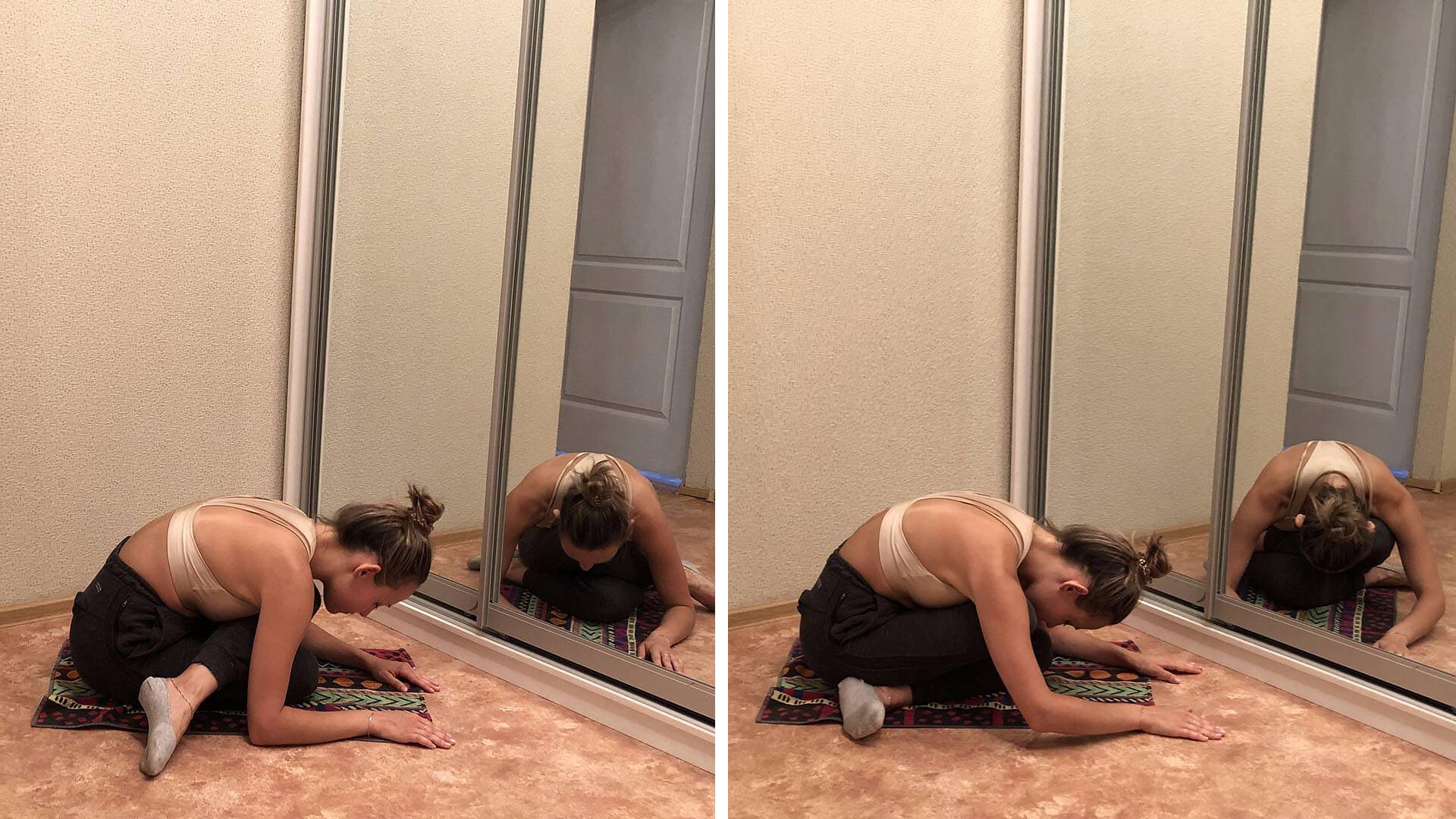 - Из положения сидя соедините стопы перед собой, подвинув как можно ближе к себе.