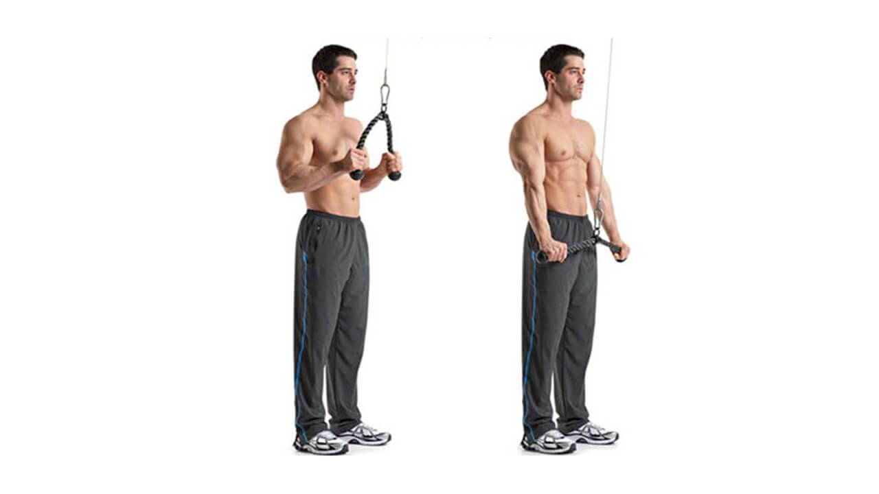 В данном упражнении нагрузка смещается на латеральную головку посредством пронации кистей, то есть их вращения внутрь. Этому будет максимально способствовать канатная рукоять, которая крепится к верхнему блоку кроссовера.