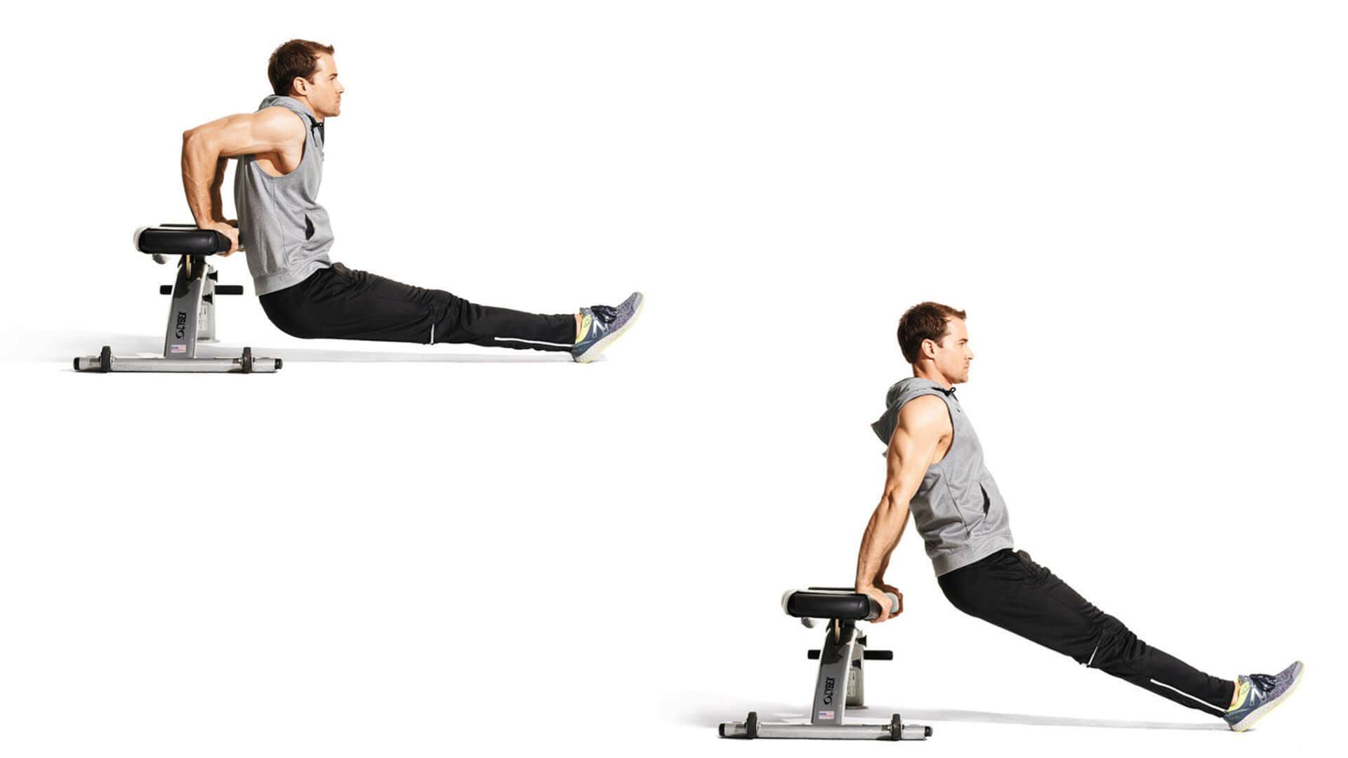 Более подготовленным атлетам прекрасным способом проработки нужной головки будут отжимания на брусьях. Суть их эффективности в расставленных относительно туловища локтях.