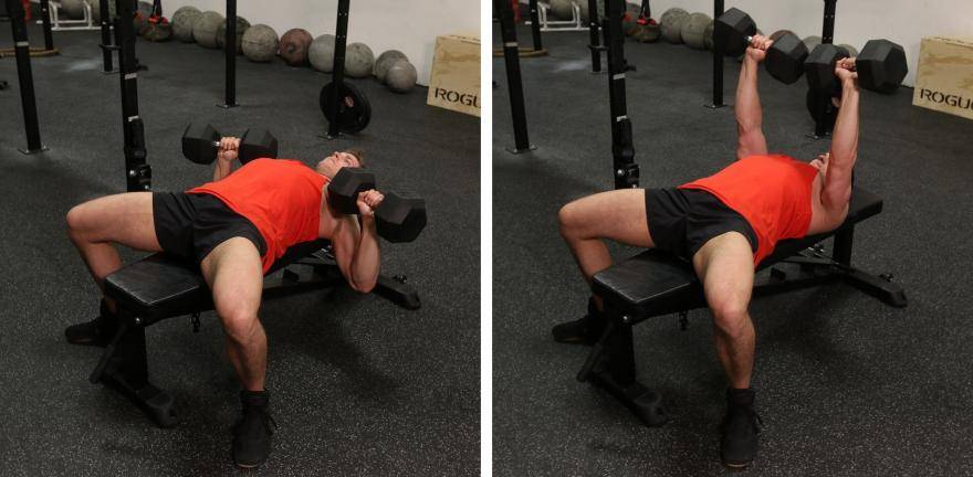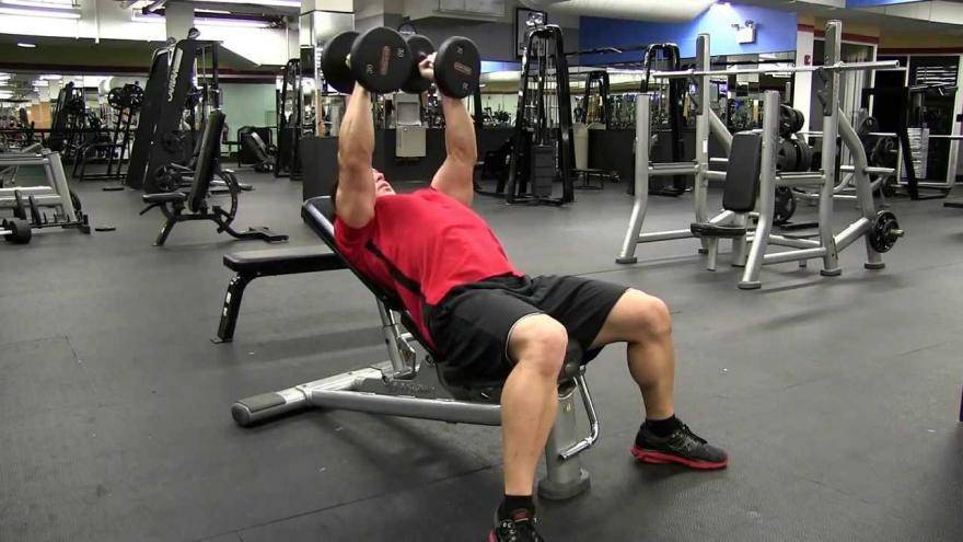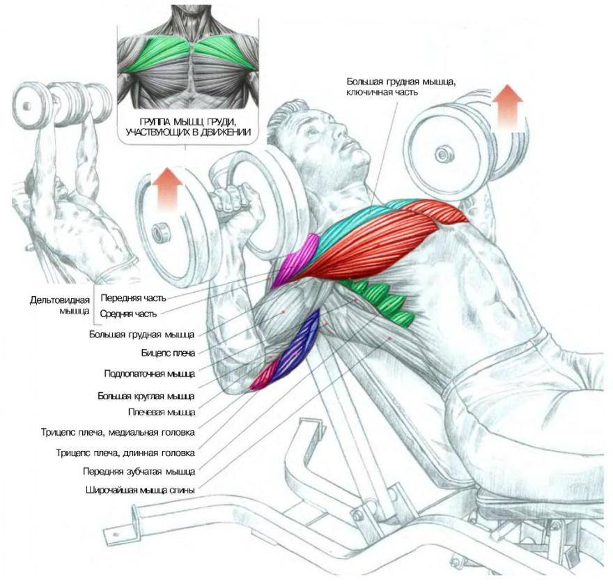 Верхняя часть грудных мышц качается лучше всего при наклоне скамьи градусов. Также работают передние пучки дельтовидных мышц и трицепсы. В отличие от выполнения данного упражнения со штангой, с гантелями достигается более широкая амплитуда движения.