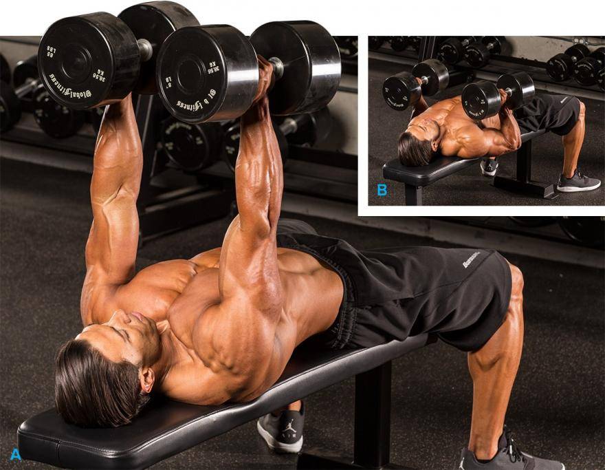 Но важно помнить, что опускание гантелей ниже уровня груди может привести к травме. На скамье нужно лежать ровно, гантели двигаются вертикально над средним отделом груди