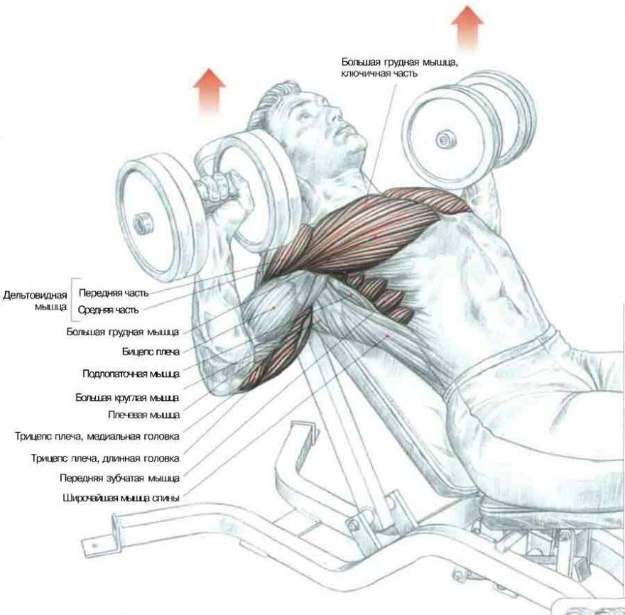 Верхняя часть грудных мышц качается лучше всего при наклоне скамьи градусов. Также работают передние пучки дельтовидных мышц и трицепсы. В отличие от выполнения данного упражнения со штангой, с гантелями достигается более широкая амплитуда движения.