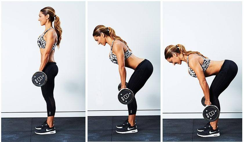 Так называемая, мертвая тяга с гантелями для девушек, подойдет тем, кто хочет прокачать большую ягодичную мышцу, а также укрепить мышцы торса и придать им рельеф. Инструкторы тренажёрных залов отмечают, что такой вид упражнений рекомендуется использовать мужчинам в начале тренировок, когда противопоказано использовать сразу большие веса.