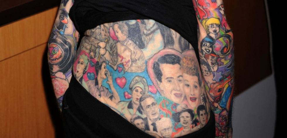 На левом бедре неординарной девушки присутствует религиозное тату Ноя в окружении семи гномов, а на левом бедре красуются Винни-Пух, Моряк Папай и Фред Флинтстон. Немного дальше на бедре набит логотип Мировых Рекордов Гинесса.