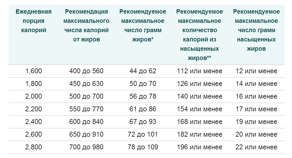 Узнав количество калорий, которое потребует вам на протяжении всего дня, вы можете воспользоваться таблицей ниже, чтобы разобраться с количеством общих насыщенных жиров и ненасыщенных, которые нужны будут вам каждый день.