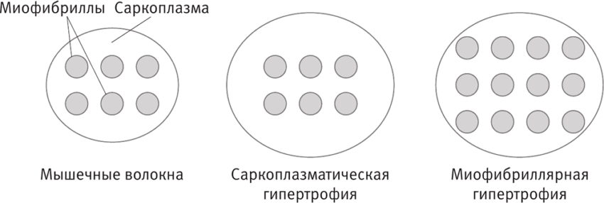Гипертрофия мышц — это процессы увеличения мышечного волокна и окружающей его питательной жидкости (саркоплазмы). Силовые тренировки с тяжелым весом и низким количеством повторов развивают больше влияют на саркоплазматическую гипертрофию, функциональный тренинг и кардио — на миофибриллярную.
