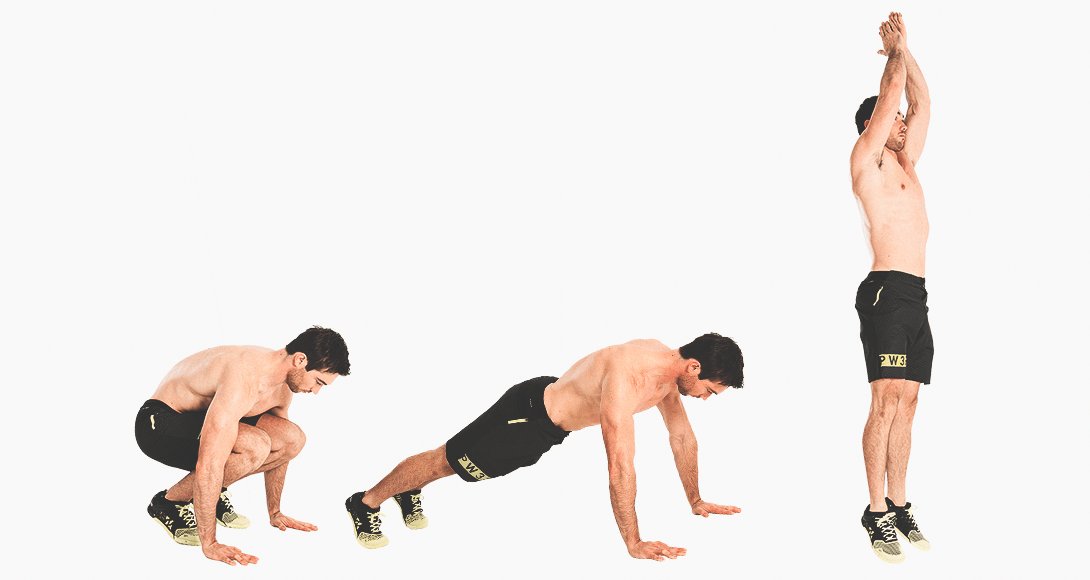 Примите положение лежа, так чтобы пола касались таз и грудь. Отожмитесь, затем подтяните колени к груди. И уже с присяда, выпрыгните вверх вытягивая руки.