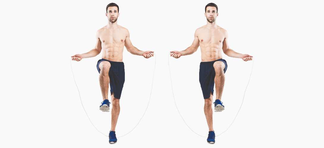 2) 3–4 минута — прыжки через скакалку с высоким подъёмом коленей;