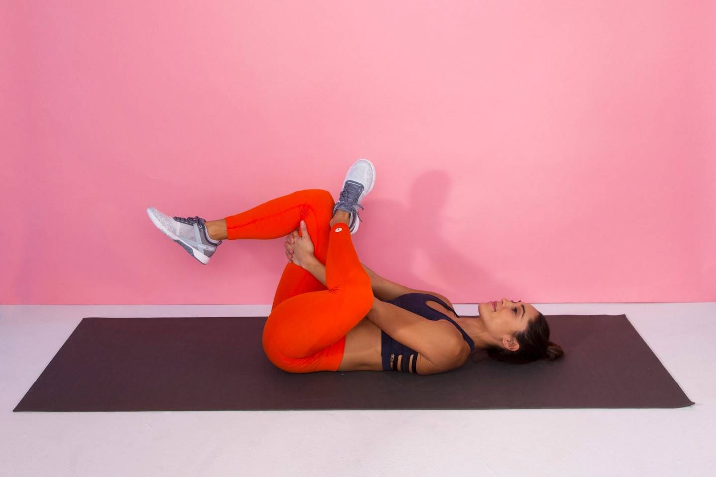 - Лягте на коврик. Подтяните согнутое колено к себе, держа его руками, старайтесь прижать к себе ногу, зафиксируйте данное положение. Не теряйте вторую ногу, она должна быть напряжена, представьте, что Вы упираетесь ногой в стену.
