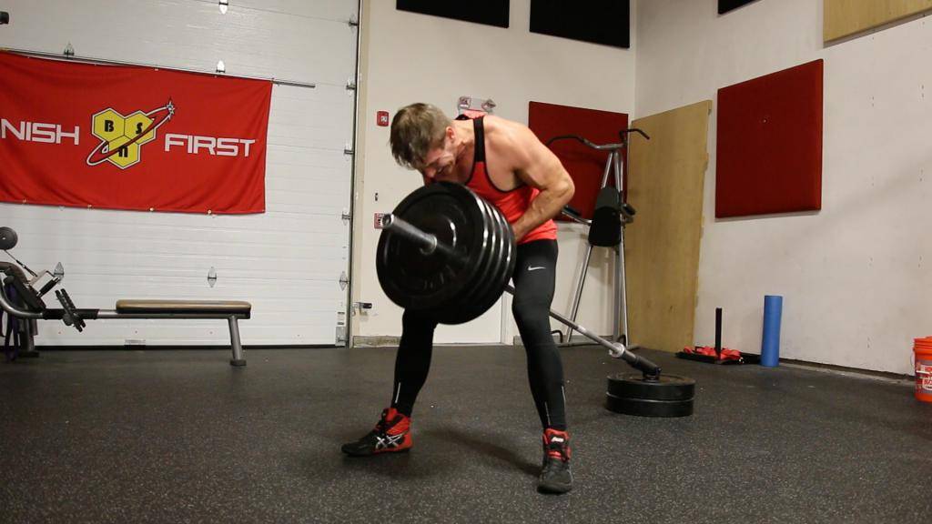 - Делая вдох, опустите снаряд в изначальную позицию, но так, чтобы гриф не касался пола.