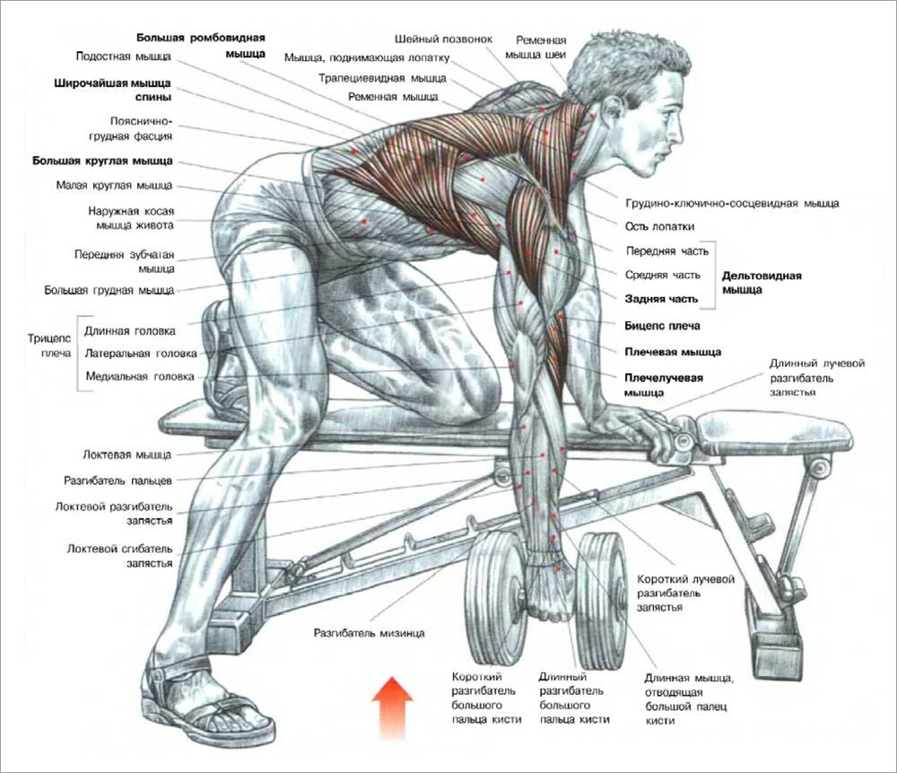 Какие еще мышцы работают во время тяги гантелей? Несомненно, к ним можно отнести и предплечья, и бицепсы. Гантели, как правило, должны отводиться за спину в согнутой в локте руке, а удерживать ее в таком положении, без участия бицепса и предплечья невозможно.