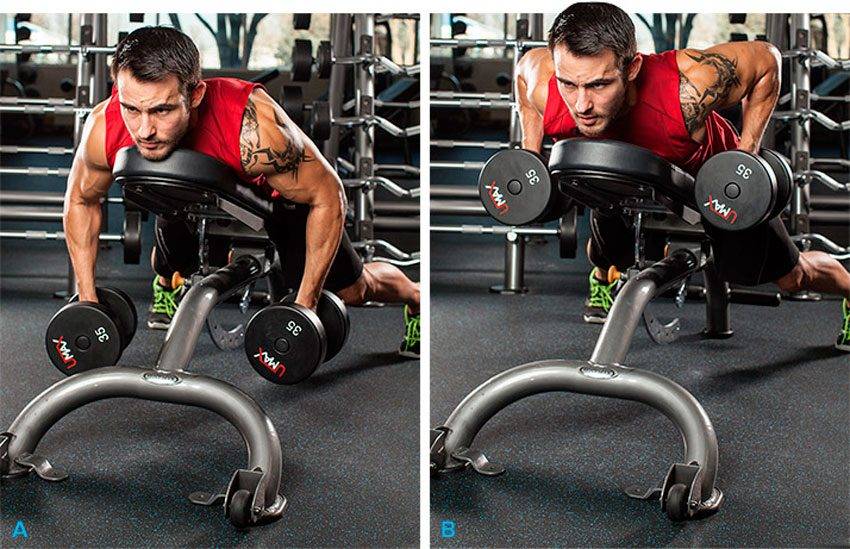 Основной вариант — тяга гантелей в упоре на скамью